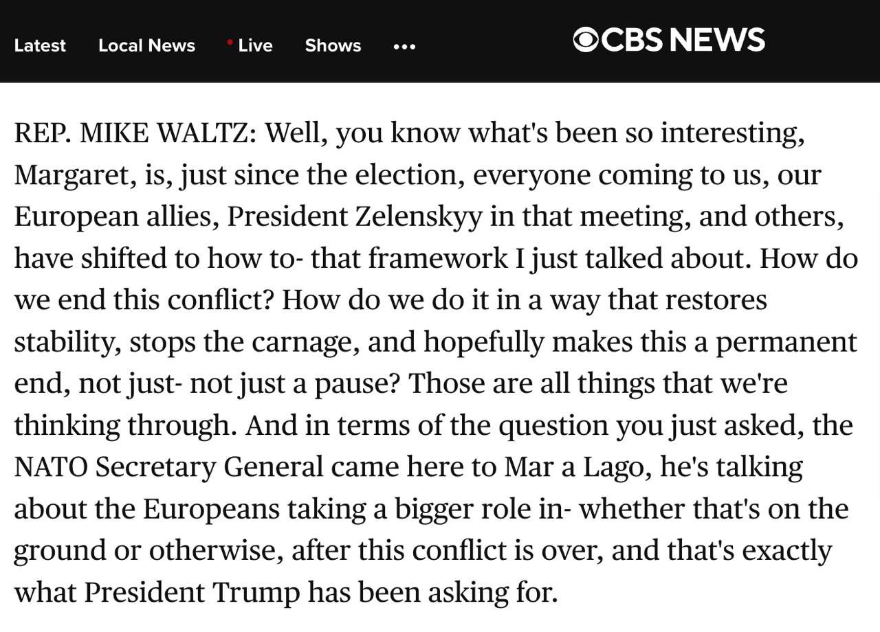 Будущий советник президента по нацбезопасности Майкл Уолтц заявил, что «пустой чек» (неограниченная поддержка) — "это не стратегия".
