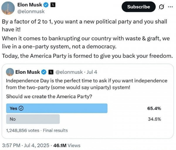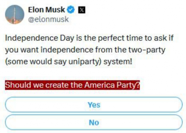 Скандал Илона Маска с Дональдом Трампом все никак не может успокоиться. Бывшие соратники уже не первую неделю ехидно кидают в друг друга разные посты в местных соцсетях. Но в этот раз Маск решил пойти ва-банк и, воспользовавшись Днем независимости, запустил онлайн-опрос на тему, нужна ли стране третья политическая партия, которая бы отстроилась как от демократов, так и от республиканцев.