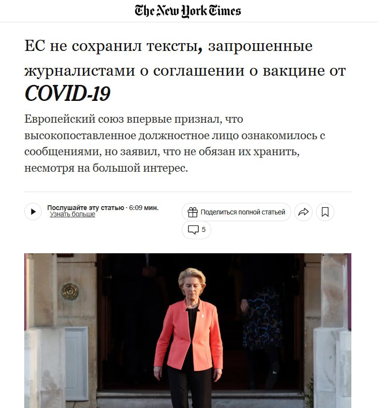 Переписка Урсулы фон дер Ляйен и гендиректора Pfizer Альберта Бурла утеряна или уничтожена, сообщает NYT. Она была доказательством коррупционного сговора между властями ЕС и компанией по закупкам вакцин от коронавируса.