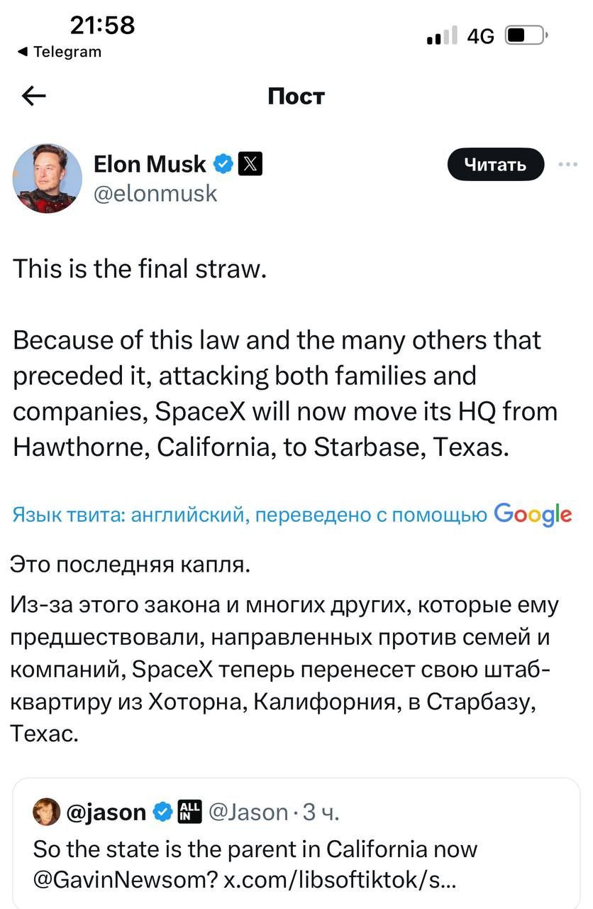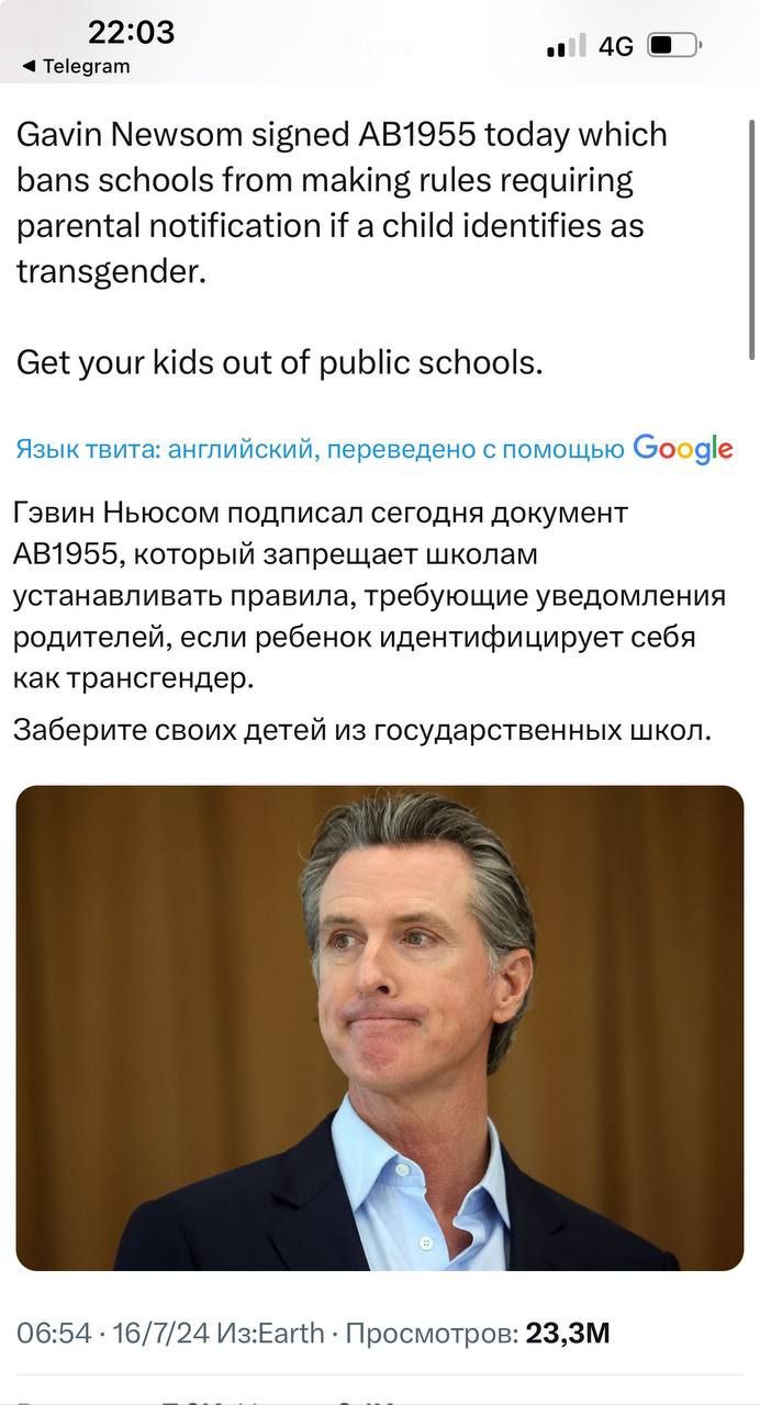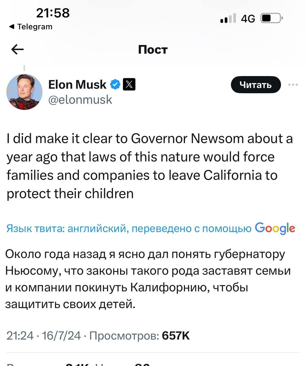 ✔️Реакция Илона Маска на подписанный губернатором Калифорнии законодательный акт, фактически запрещающий школам уведомлять родителей, если ребенок идентифицирует себя как трансгендер