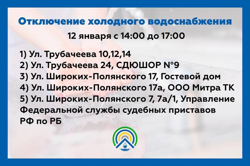 Воду отключат по причине проведения плановых-восстановительных работ на водопроводной сети d - 100 мм. по улице Трубачеева 12.