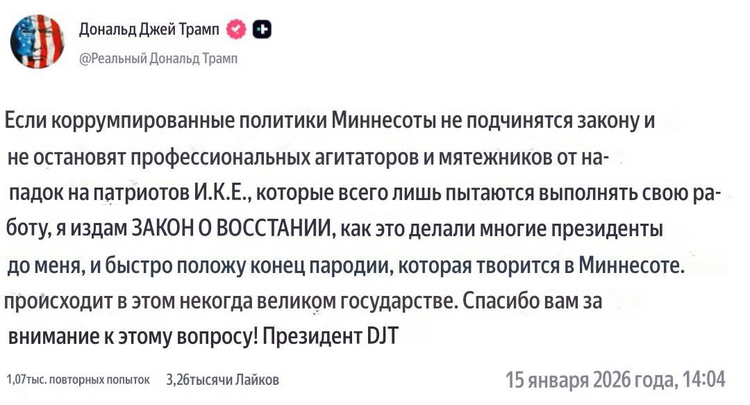 Дональд Трамп угрожает применить в штате Миннесота Закон о мятеже