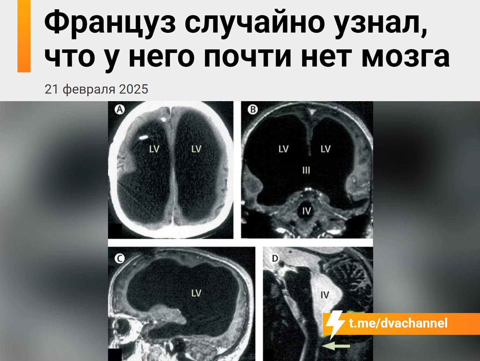 Всё началось с того, что он почувствовал боль и слабость в ноге, и врачи решили сделать МРТ всего тела. Результат убил: в его черепе было очень мало мозгового вещества, вместо этого череп был заполнен жидкостью, а мозг сжался в тонкий слой у края черепа.