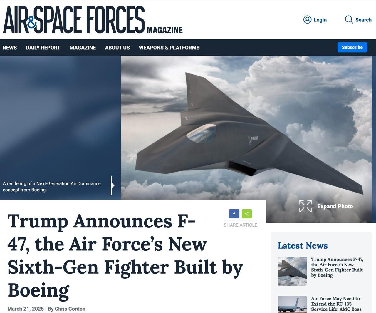 Трамп объявил, что Boeing выиграл у Lockheed Martin конкурс на разработку пилотируемого истребителя шестого поколения - F-47. На разработку потратят не менее 20 млрд долл., сам самолёт будет стоить около 300 млн дол, соответственно компания получит заказов на сотни миллиардов долларов.