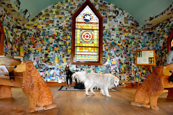При входе в часовню человека буквально заливает свет, исходящий от витражей, на которых изображены собаки, украшенные резьбой по дереву. Внутренние стены увешаны рукописными заметками и фотографиями собак и других животных, которые ушли из жизни, а на столах выставлены угощения для посетителей. Вокруг Собачьей горы установлены различные скульптуры собак, а вывеска перед часовней гласит: "Приветствуются представители всех вероисповеданий, всех пород. Догмы запрещены".