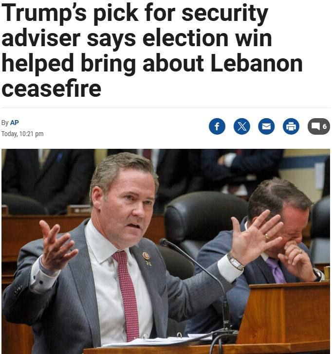 "Его победа послала ясный месседж остальному миру о том, что хаос [США] терпеть не будут. Я рад видеть конкретные шаги по деэскалации на Ближнем Востоке", - заявил будущий советник Трампа по нацбезопасности Майк Уолтц.