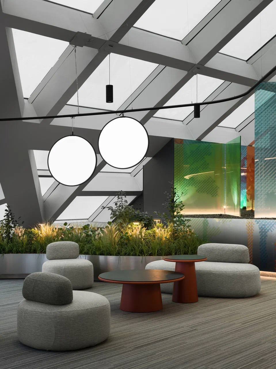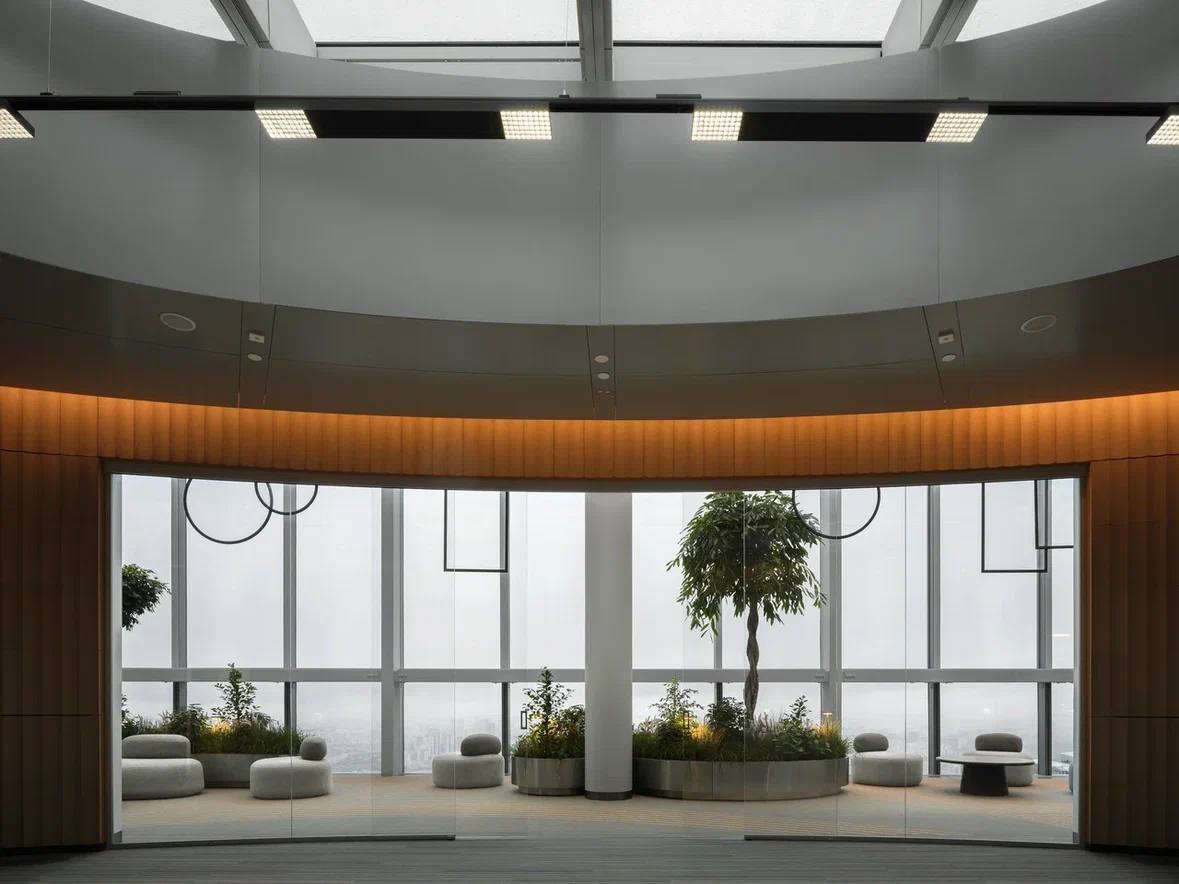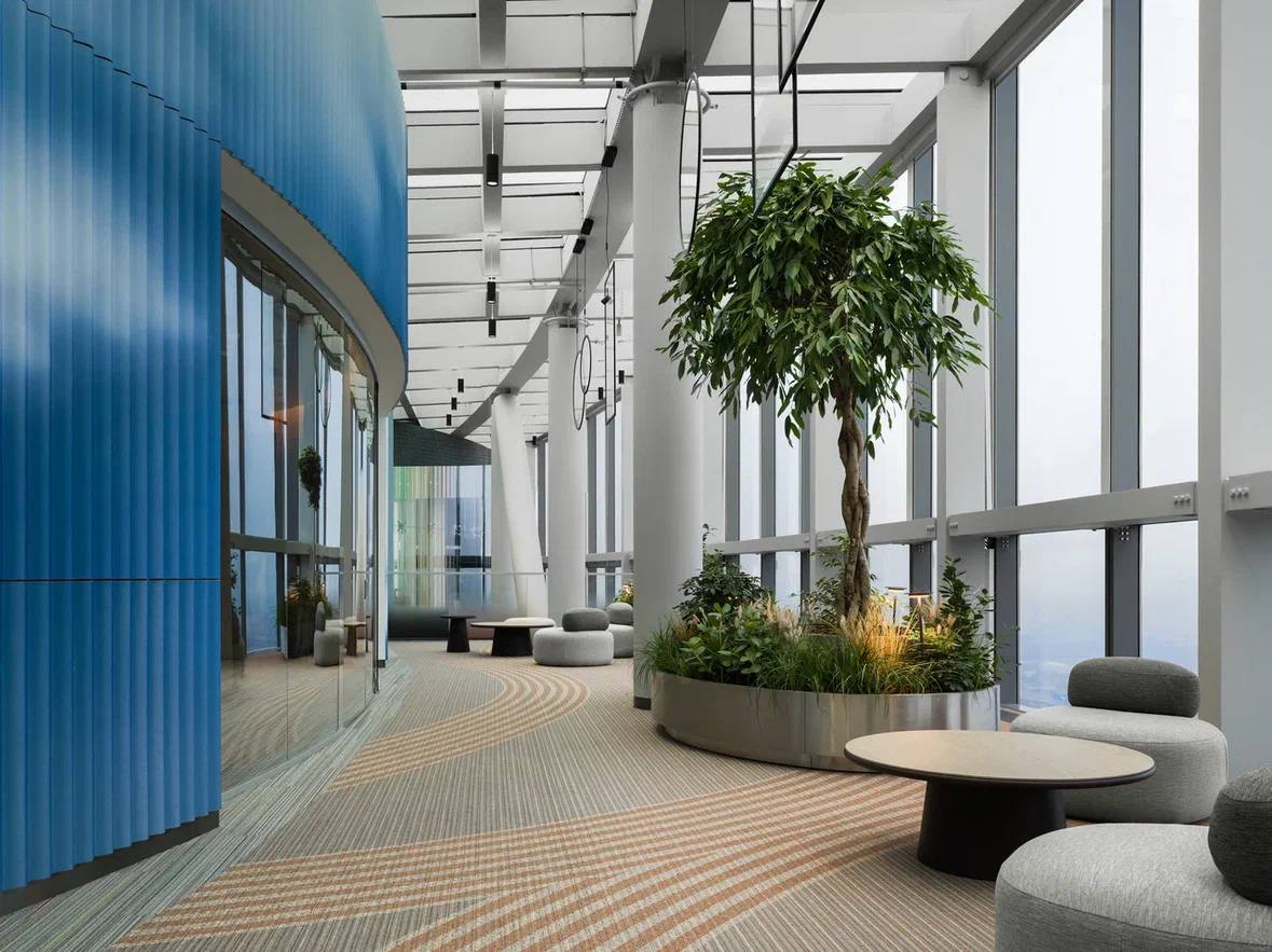 Сам офисный пентхаус – полноценный высококлассный бизнес-актив, где представительские функции органично сочетаются с продуманной рабочей инфраструктурой. Пространство спроектировано так, чтобы на разных уровнях смогли разместиться операционные сотрудники, топ-менеджмент и владельцы компании, для которых продумана комплексная инфраструктура. На первом уровне расположены ресепшн, гибкие рабочие пространства, комнаты тишины, лаунж-зоны, кафе и библиотека. Здесь будут размещаться сотрудники, выполняющие основные операционные задачи. Выше – уровень для топ-менеджеров, с индивидуальными кабинетами и зонами для ассистентов, приёмными и переговорными. На самом верхнем уровне – рабочая резиденция для первых лиц с камерными переговорными, конференц-залом, VVIP-кабинетами и отдельным зеленым лаунж-пространством для отдыха.