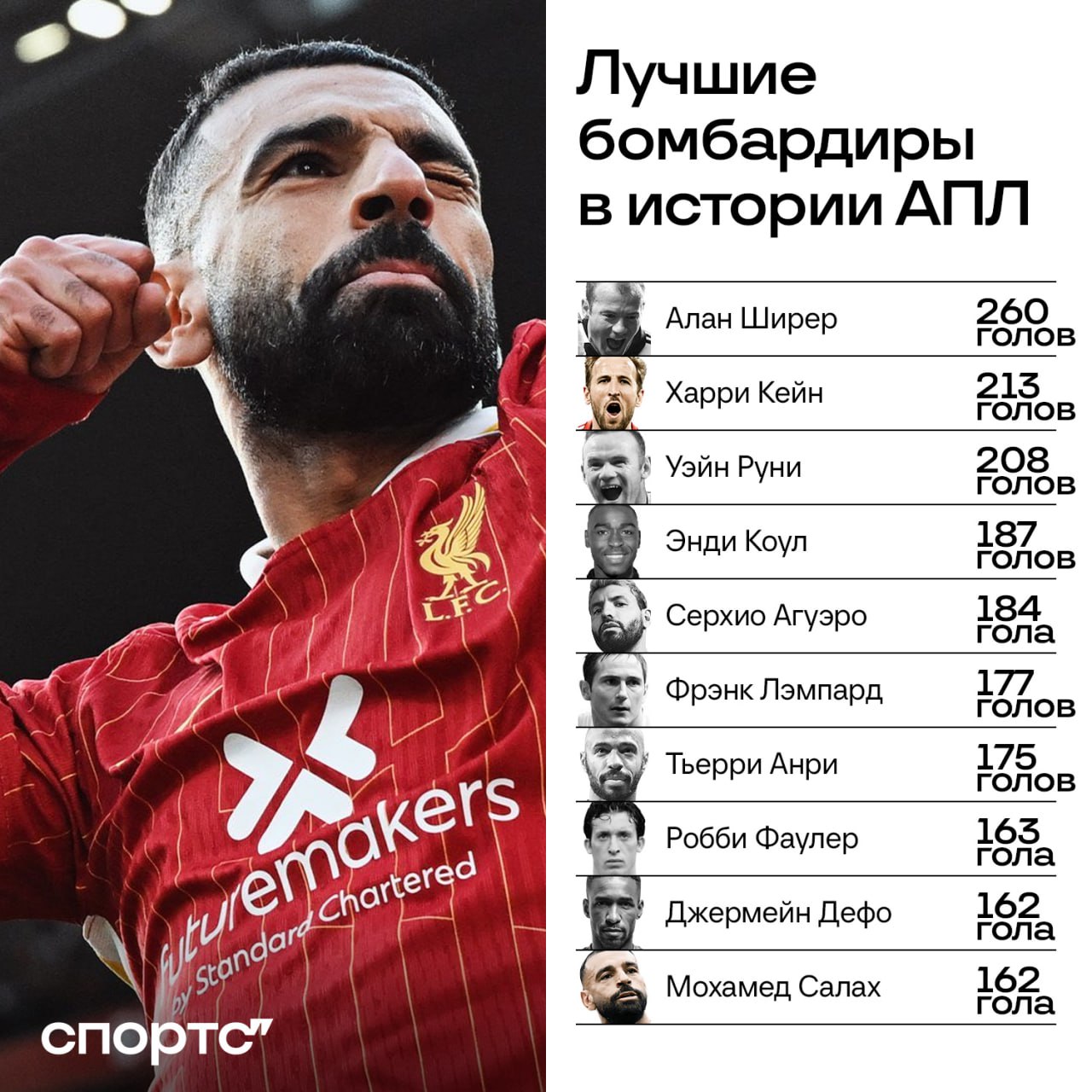 🇪🇬🏴 Гол Салаха в ворота «Челси» позволил египтянину ворваться в список лучших бомбардиров АПЛ за всю историю: сейчас Мо делит девятое место с Дефо. На каком будет, если останется в «Ливерпуле»?