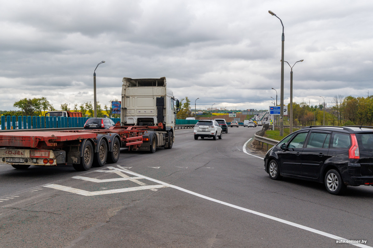 Дело было на внешнем кольце МКАД перед съездом на проспект Независимости. Автомобиль с регистратором движется по обочине, подъезжает к месту, где начинается полоса для съезда. И в этот момент в нее перестраивается фура.