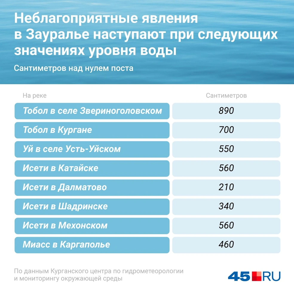 Неблагоприятные явления наступают в Кургане при уровне воды в Тоболе в 700 см. При подъеме уровня воды до 7 метров 20 см закрывают шоссе им. Тюнина.