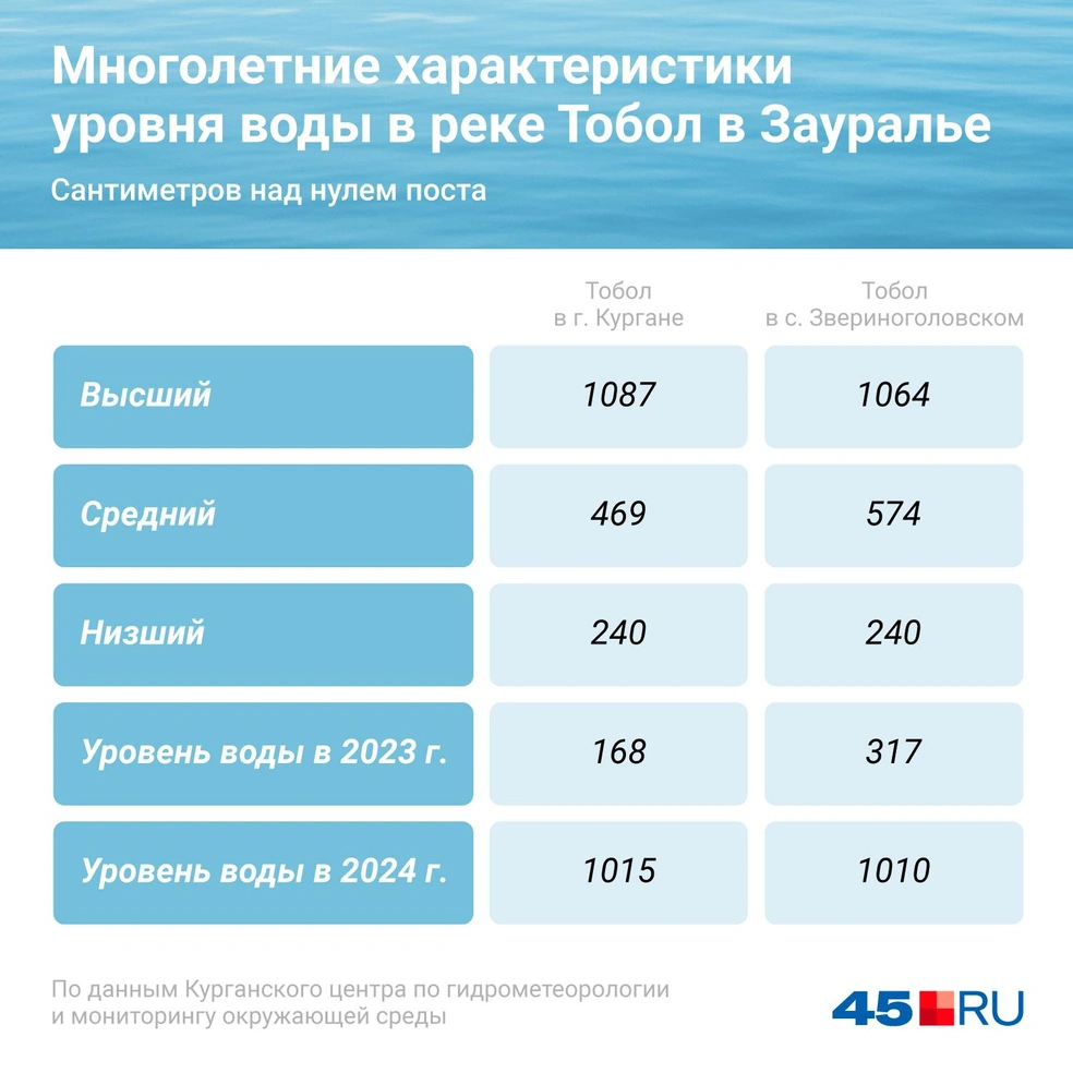 Начнем с максимального уровня воды, который когда-либо был в реке Тобол. Это 1087 см. До такого уровня вода поднималась в 1947 году. После многолетних наблюдений специалисты установили, что в среднем уровень воды весной в Кургане в Тоболе составляет 469 см. Это и есть норма! Низший уровень воды — 240 см.