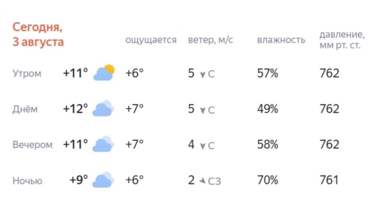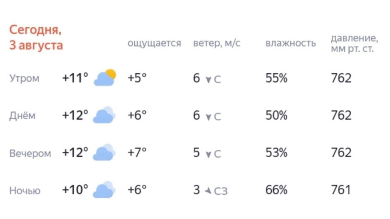 В Сургуте почти весь день будет пасмурно. В утренние часы обещают +11 градусов, днем потеплеет до +12 градусов. К вечеру температура вновь опустится до +11 градусов, ночью — +9 градусов. Ветер — северный с переходом в северо-западный, 2-5 м/с.