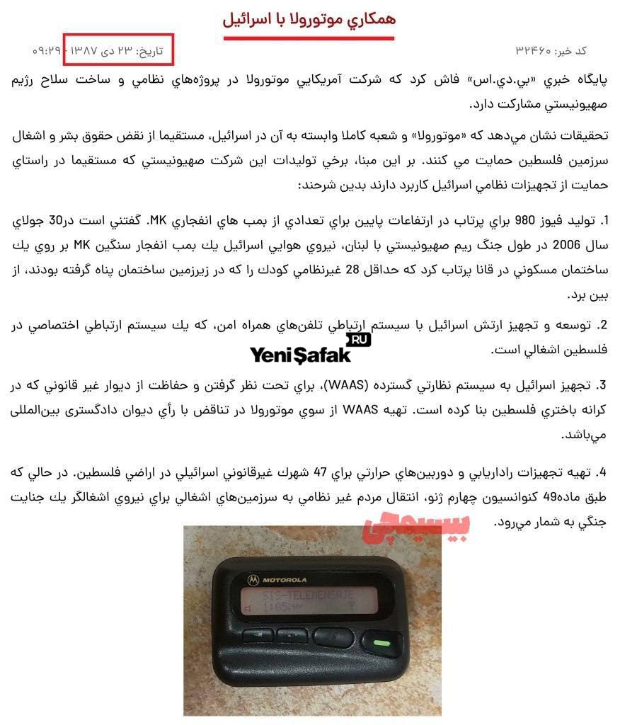 Турецкая газета Yeni Safak со ссылкой на источники в Корпусе стражей исламской революции Ирана пишет, что взорвавшиеся пейджеры были произведены американской компанией Motorola.