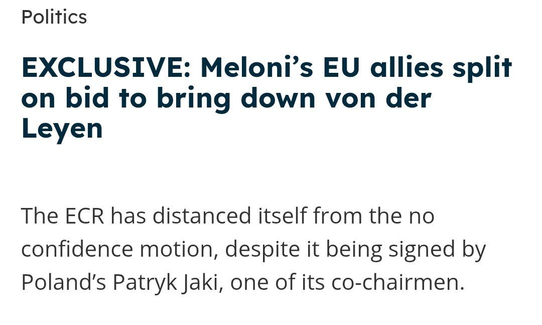 Euractive: национальная консервативная группа ЕС, возглавляемая партией «Братья Италии» Джорджии Мелони и польской партией «Право и справедливость», разделилась из-за попытки сместить Европейскую комиссию Урсулы фон дер Ляйен.