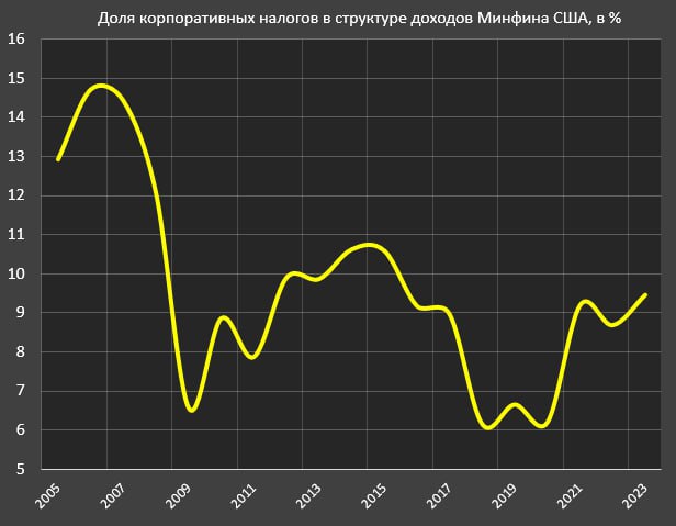 В 2004-2007 (те славные времена, когда мир еще был вменяемым) доля корпоративных налогов в структуре совокупных доходов Минфина США составляла в среднем 14%, а за три последних года лишь 9%, т.е. недоплачивают около 5 п.п, что составляет минимум 230-250 млрд в год – это если сравнить с нормой 2004-2007.