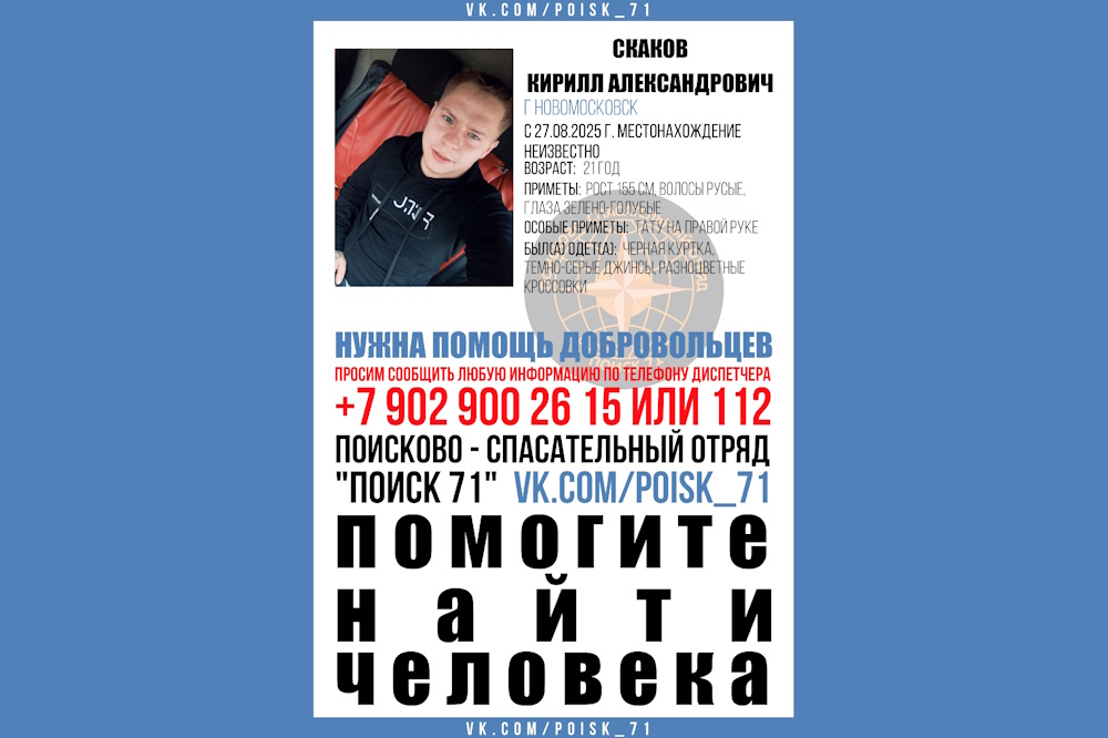 В Тульской области пропал 21-летний житель Новомосковска по имени Кирилл Александрович Скаков, сообщает региональный поисково-спасательный отряд «Поиск 71».