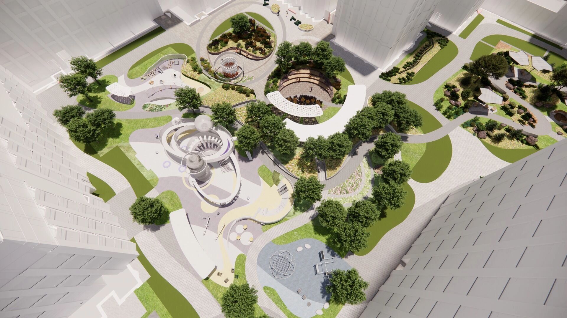 Акцентными элементами проекта будут камерная зона отдыха с извилистыми дорожками, скамьи из натурального камня, перголы бионической формы, детская площадка в виде атомной структуры и спортивно-игровая зона с арт-объектом.