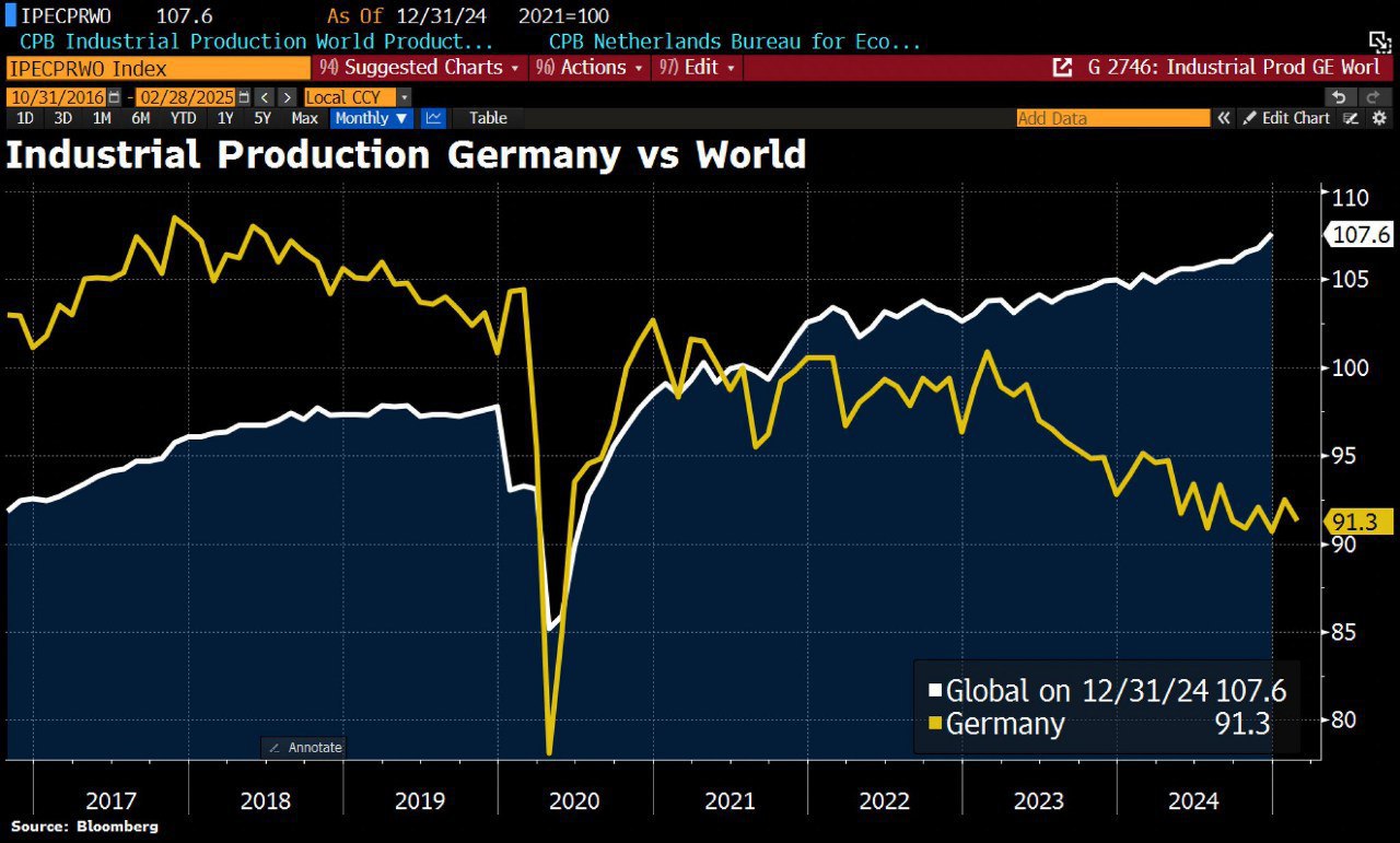 Германия ещё не отошла от уничтожения своей экономики санкциями против России. Промышленное производство в Германии неожиданно вновь упало на 1,3% в феврале.