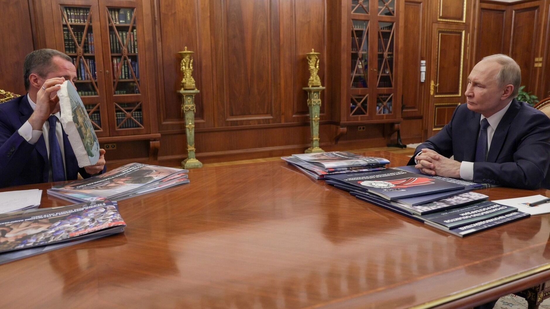 Кроме того, Вячеслав Гладков подарил президенту картину местной художницы, которую та сделала на обломке ракеты ПВО.
