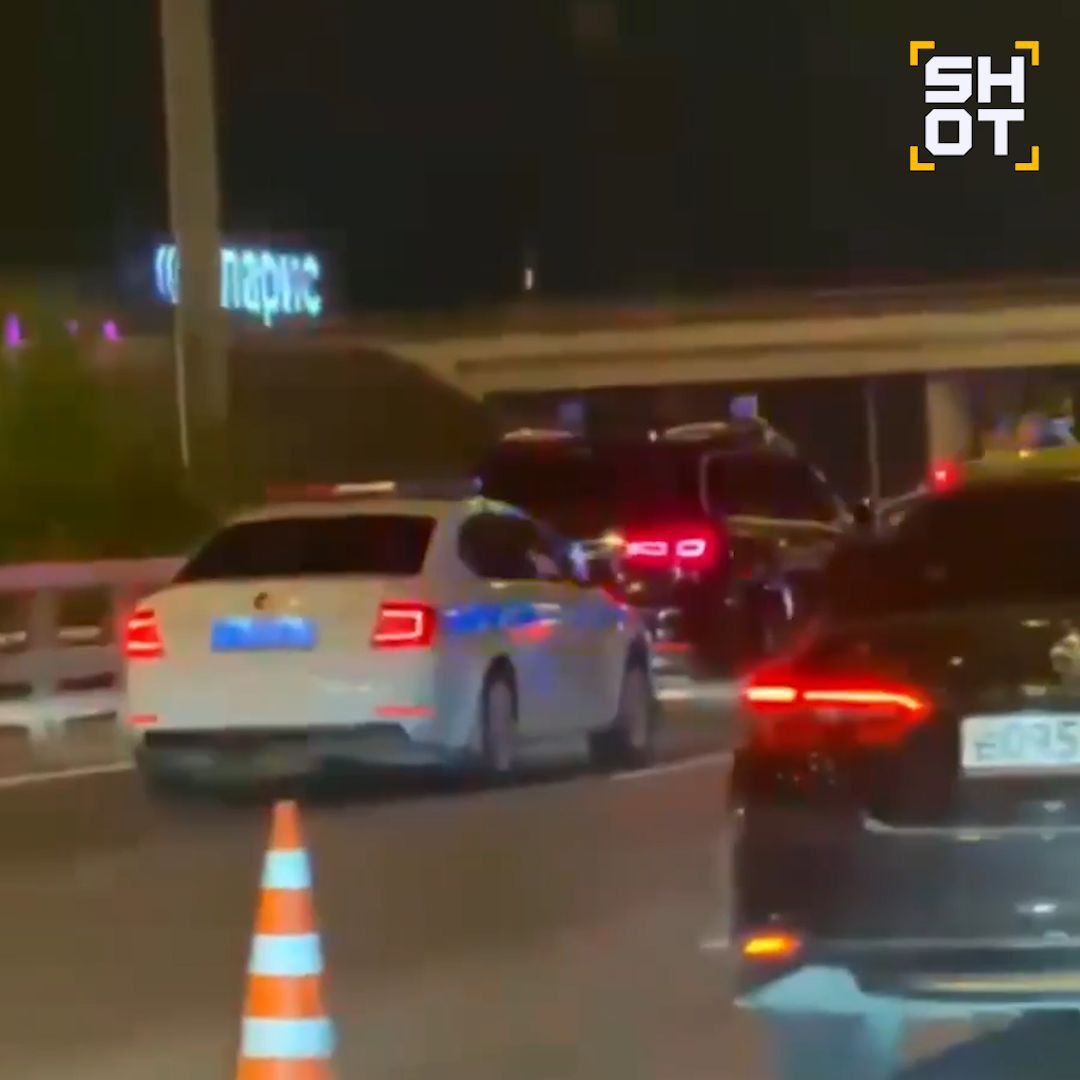 Водителя и пассажиров чëрного «Мерседеса», остановленного полицией в районе Киевского шоссе, увезли с места в сопровождении нескольких служебных машин. Об этом сообщили SHOT очевидцы.
