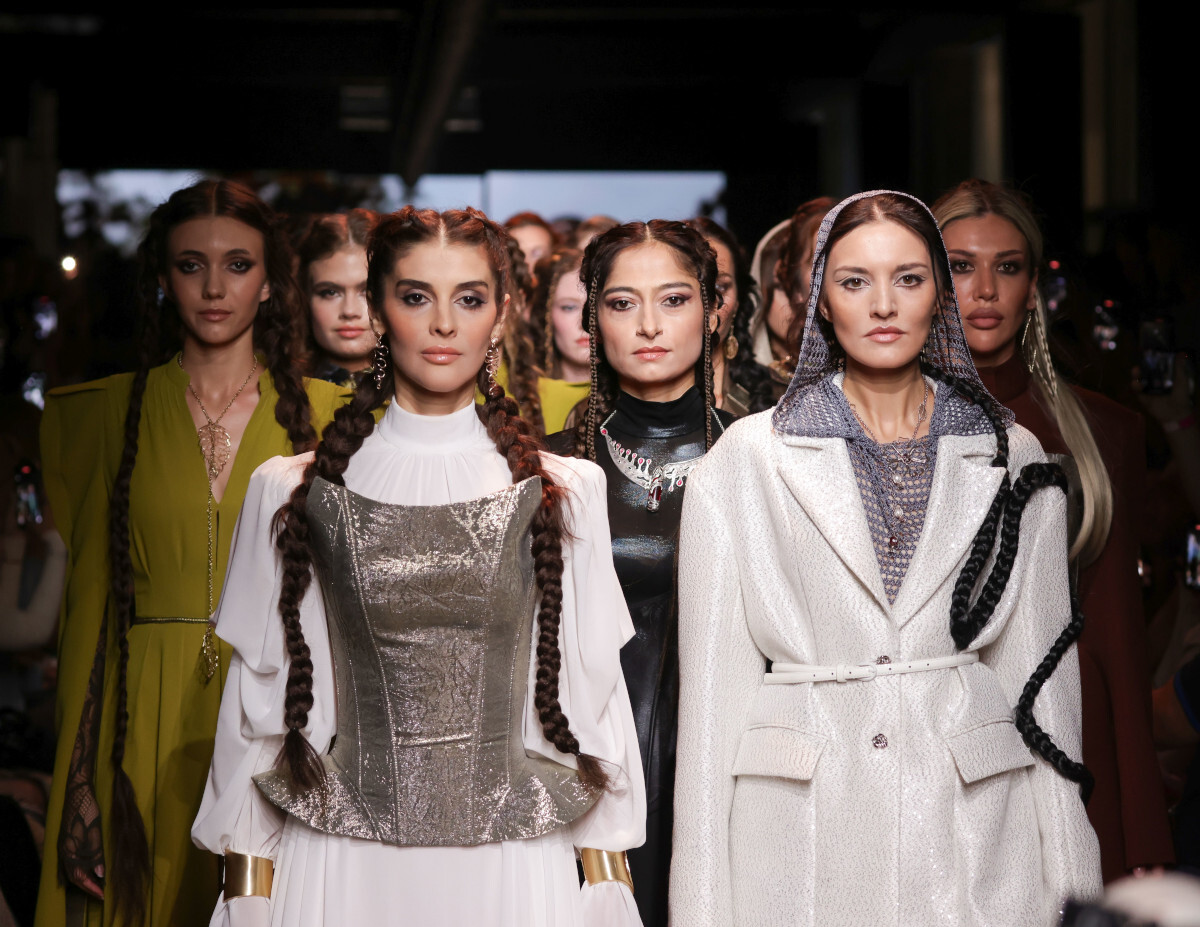 Бренд Hatsibana из Нальчика продемонстрировал новую коллекцию, вдохновленную картиной Руслана Шамеева "Амазонка" — ее смелыми линиями, насыщенной цветовой палитрой, символикой женской силы и культуры народа. Фатима Шогенова, дизайнер бренда, представила свое фешен-видение геометричных форм и мазков художника: именно эти элементы отразились в асимметричных кроях и графичных принтах коллекции. Особое внимание привлекли благородные цветовые сочетания — шоколадные, оливковые, золотистые оттенки. Отдельные детали в виде объемных подплечников, макси-рукавов с экстремальными разрезами, изделий с акцентом на талии удачно дополнили общую концепцию линейки.