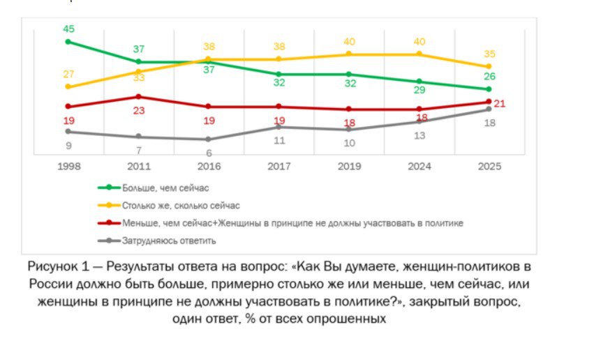 В самом ВЦИОМ прогнозируют: «Запрос на увеличение женского представительства в политике сокращается и, вероятно, сократится ещё. Скорее всего, усилится запрос на «жёсткую руку», то есть на мужское лидерство.