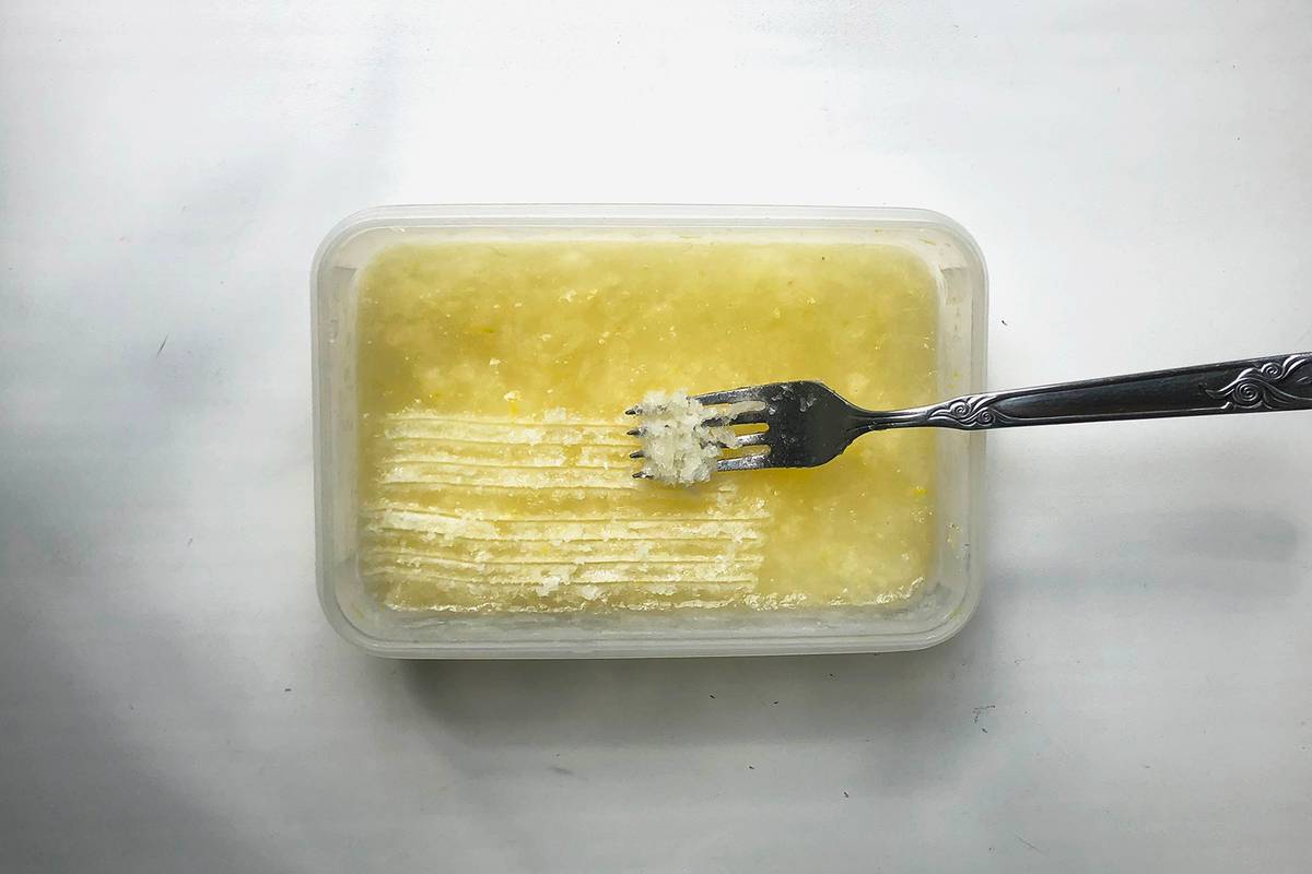 Если гранита застынет слишком сильно, ее можно будет разбить блендером или разморозить при комнатной температуре — на это уйдет примерно 20 минут — и покрошить вилкой. Моя морозилка не слишком мощная, и я без усилий и размораживания сделала все вилкой.