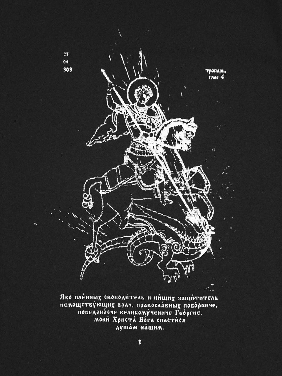 "Я́ко пле́нных свободи́тель и ни́щих защи́титель, немощству́ющих вpач, правосла́вных побо́рниче, победоно́сче великому́чениче Гео́pгие, моли́ Хpиста́ Бо́га спасти́ся душа́м на́шим."
