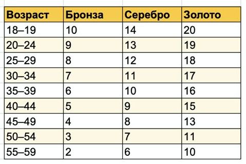 При помощи австралийских подтягиваний можно оценить силовые способности женщин по нормативам комплекса ГТО. Выполните упражнение на максимальное количество раз. Ниже таблица с возрастом и нормативами повторений.