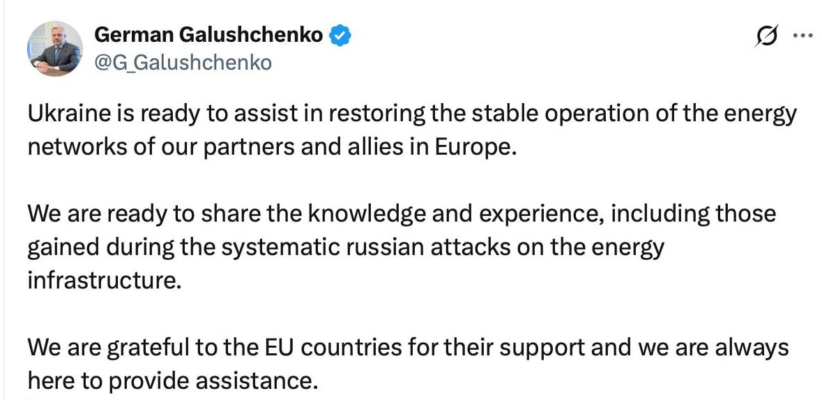 Украина готова помочь Португалии и Испании в восстановлении стабильной работы энергосетей, поделиться знаниями и опытом, заявил украинский министр энергетики Герман Галущенко.