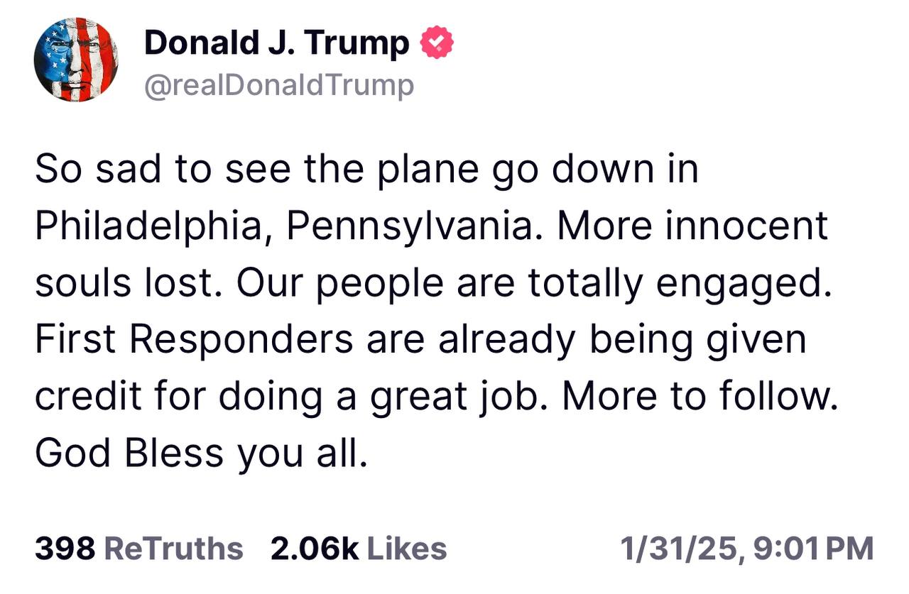 Так президент США Дональд Трамп прокомментировал крушение самолёта в Филадельфии.