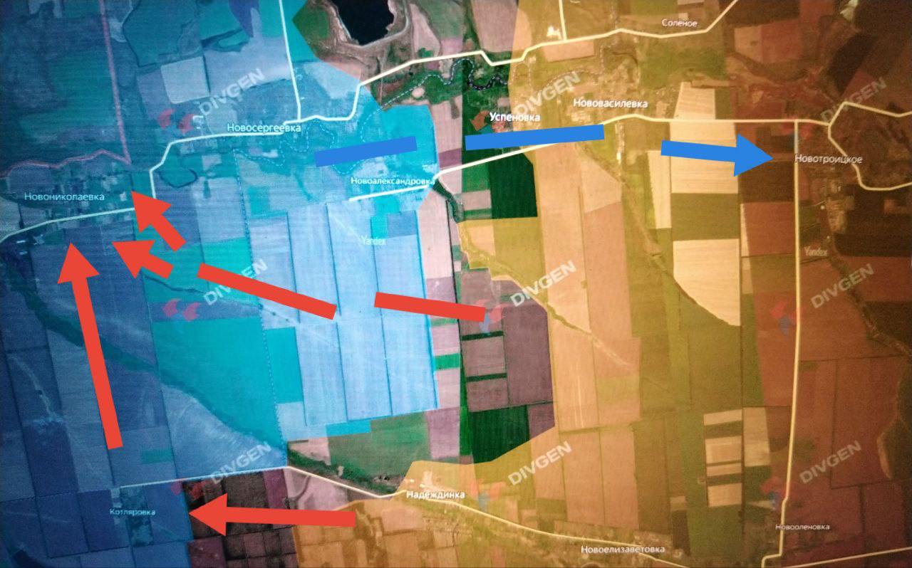 Наши подразделения предпринимают атаки в направлении Новоалександровки и Новониколаевки, выход к которой и мосту у Новосергеевки позволил бы нейтрализовать угрозу выхода ВСУ к Новотроицкому с запада. Наши предпринимают настойчивые атакующие действия как раз в полях/посадках между Новоалександровкой и Надеждинкой.