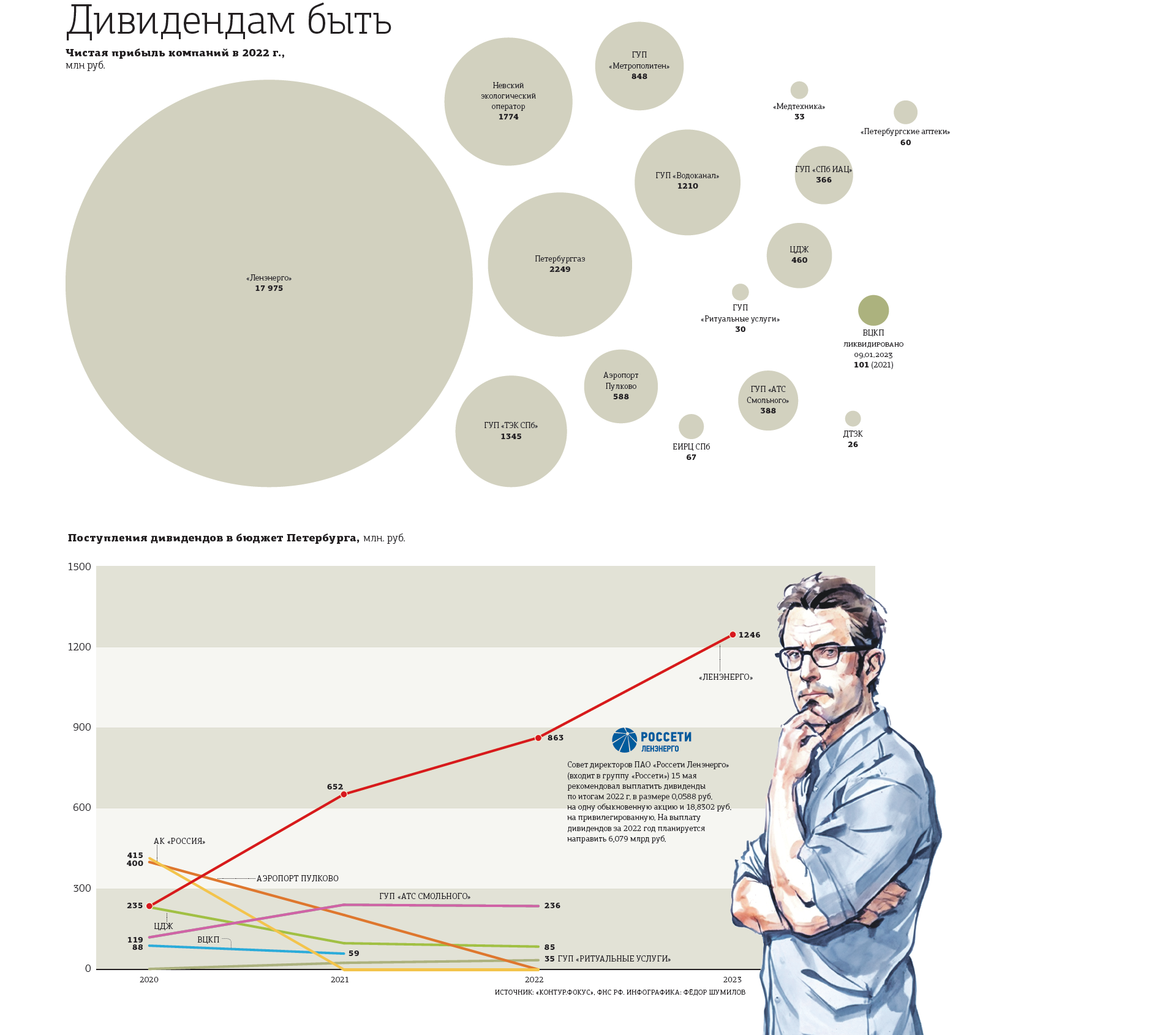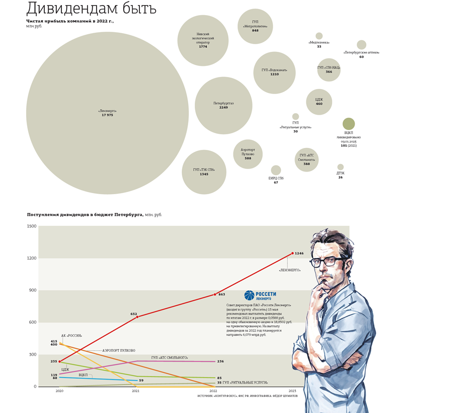 Нервозности добавляют и усиливающиеся разговоры о новой волне приватизации федеральной госсобственности: в период смены собственников могут возникать задержки с выплатой дивидендов или снижаться прибыль. Такие примеры есть и в Петербурге. Скажем, до своего акционирования ГУП "ВЦКП “Жилищное хозяйство”" (выставляло розовые квитанции) в последний раз перечислило в городскую казну в 2019 году 145,2 млн рублей. Затем, после акционирования, его выплаты резко сократились: до 88,8 млн в 2020–м и 59,3 млн в 2021–м. В 2022 году последовала реформа: к АО "ЕИРЦ Петроэлектросбыт" присоединён бывший ГУП, новое общество сменило название на АО "ЕИРЦ СПб" — и за 2022 год дивидендов уже нет.