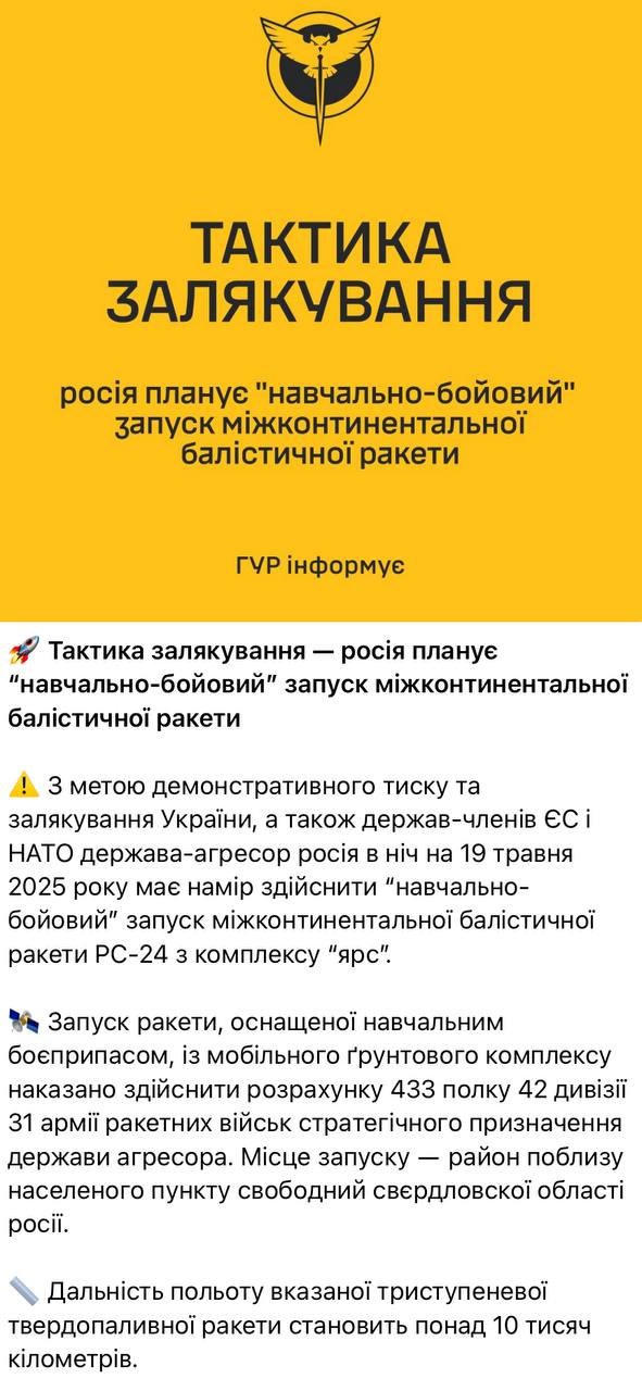 ГУР: Россия планирует этой ночью "учебно-боевой" запуск межконтинентальной баллистической ракеты РС-24 из комплекса "ЯРС". Цель запуска - демонстративное давление и запугивание Украины, а также государств-членов ЕС и НАТО».