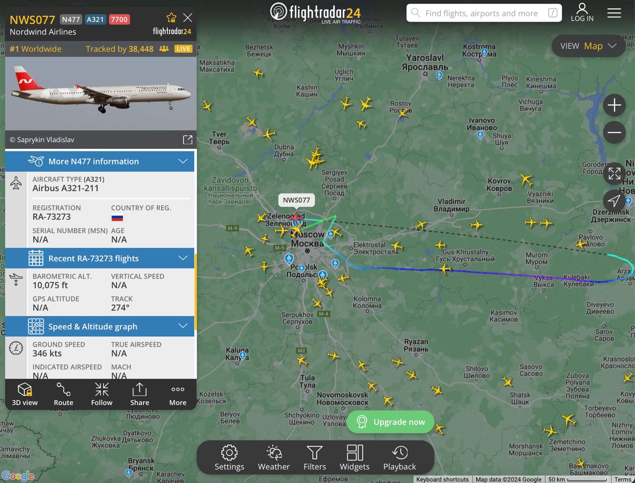 Сейчас судно снова появилось на картах — оно летит на высоте 3000 метров (это примерно в два раза меньше, чем у соседних). Самолет направляется в сторону Шереметьево.