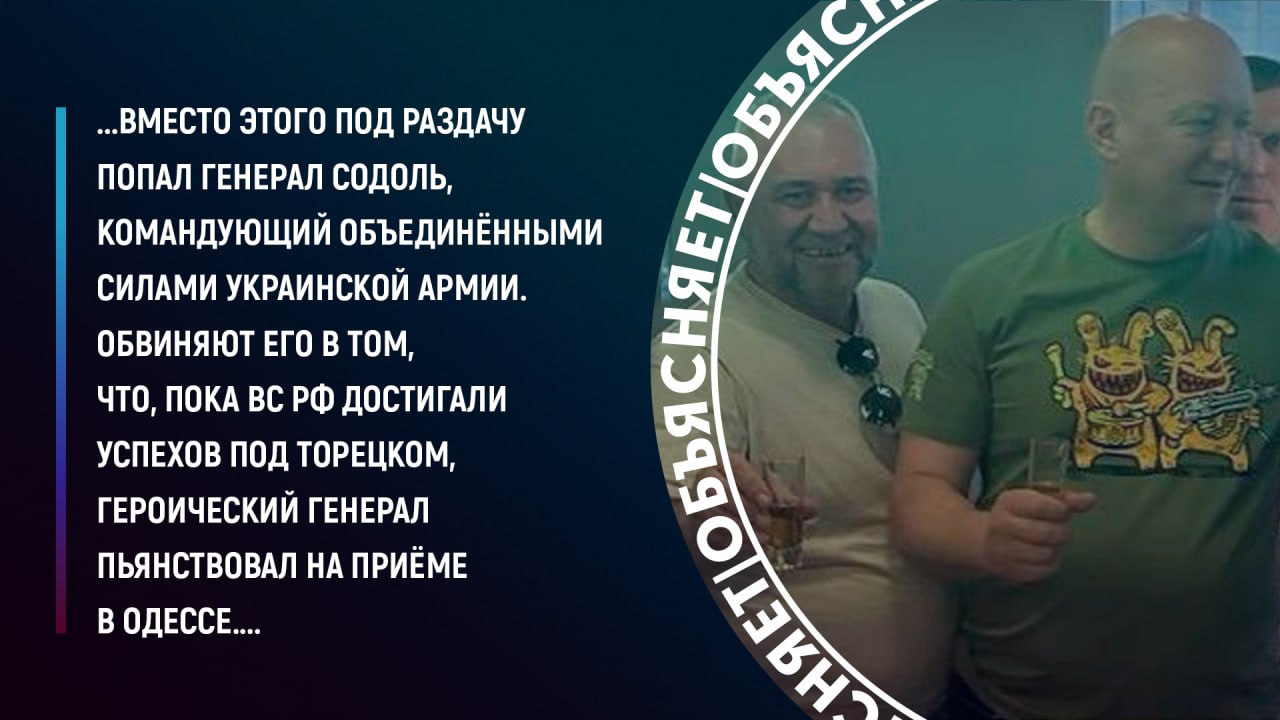Так как Сырского заменить некем, да и Зеленского он вполне устраивает (прежде всего отсутствием политических амбиций), то увольнять его не стали. Вместо этого под раздачу попал генерал Содоль, командующий объединёнными силами украинской армии. Обвиняют его в том, что, пока ВС РФ достигали успехов под Торецком, героический генерал пьянствовал на приёме в Одессе.