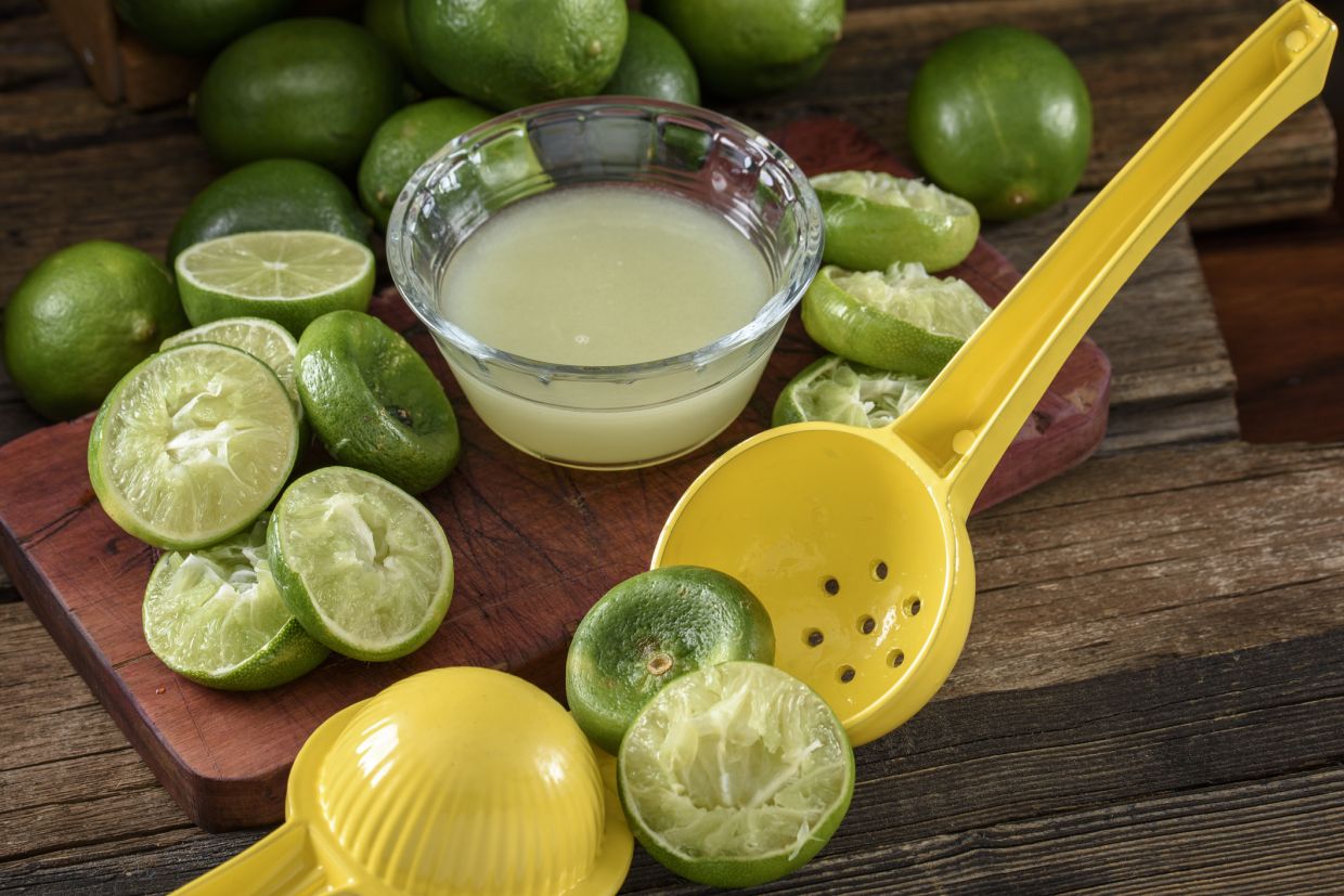 1. Тщательно помойте лаймы и обдайте кипятком. Выжмите один цитрус в соковыжималке, другой нарежьте дольками.