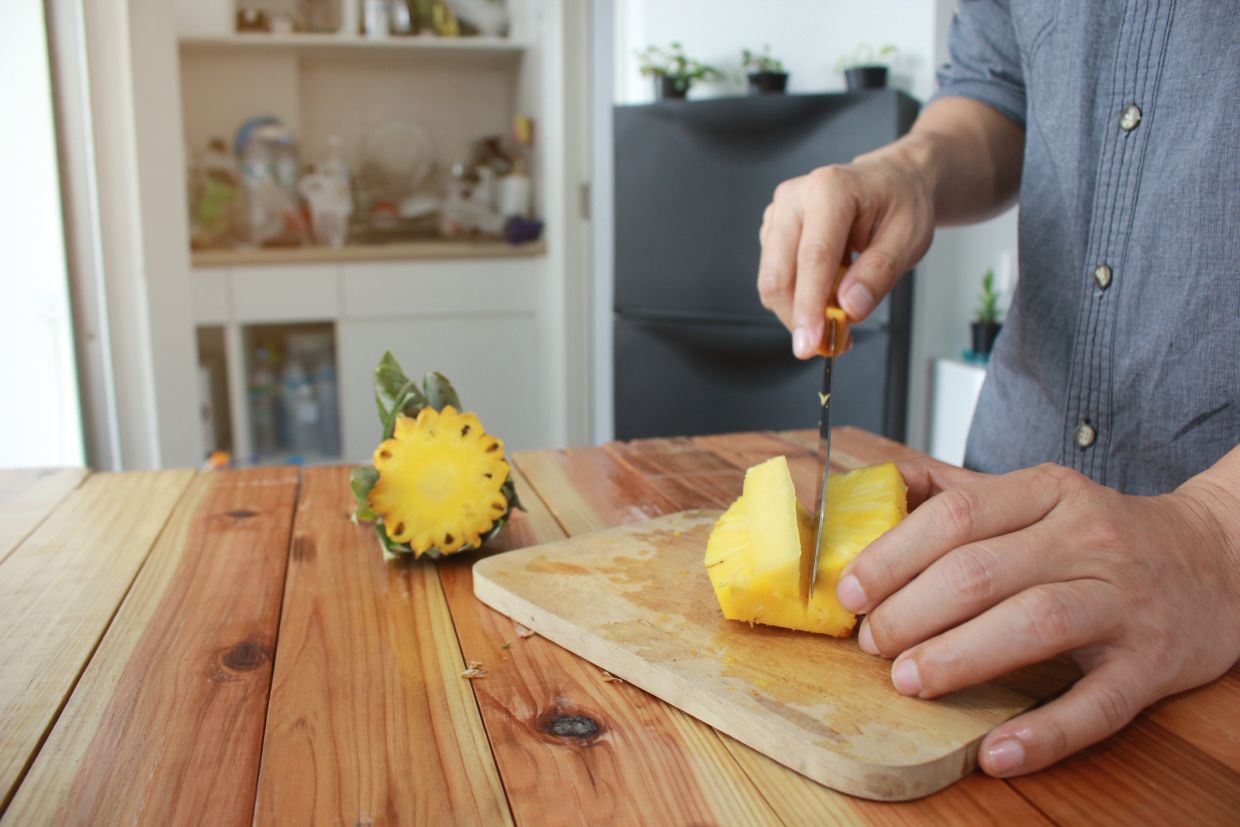 2. Вырежьте сердцевину ананаса ножом или специальным кухонным инструментом. Нарежьте мякоть кубиками.