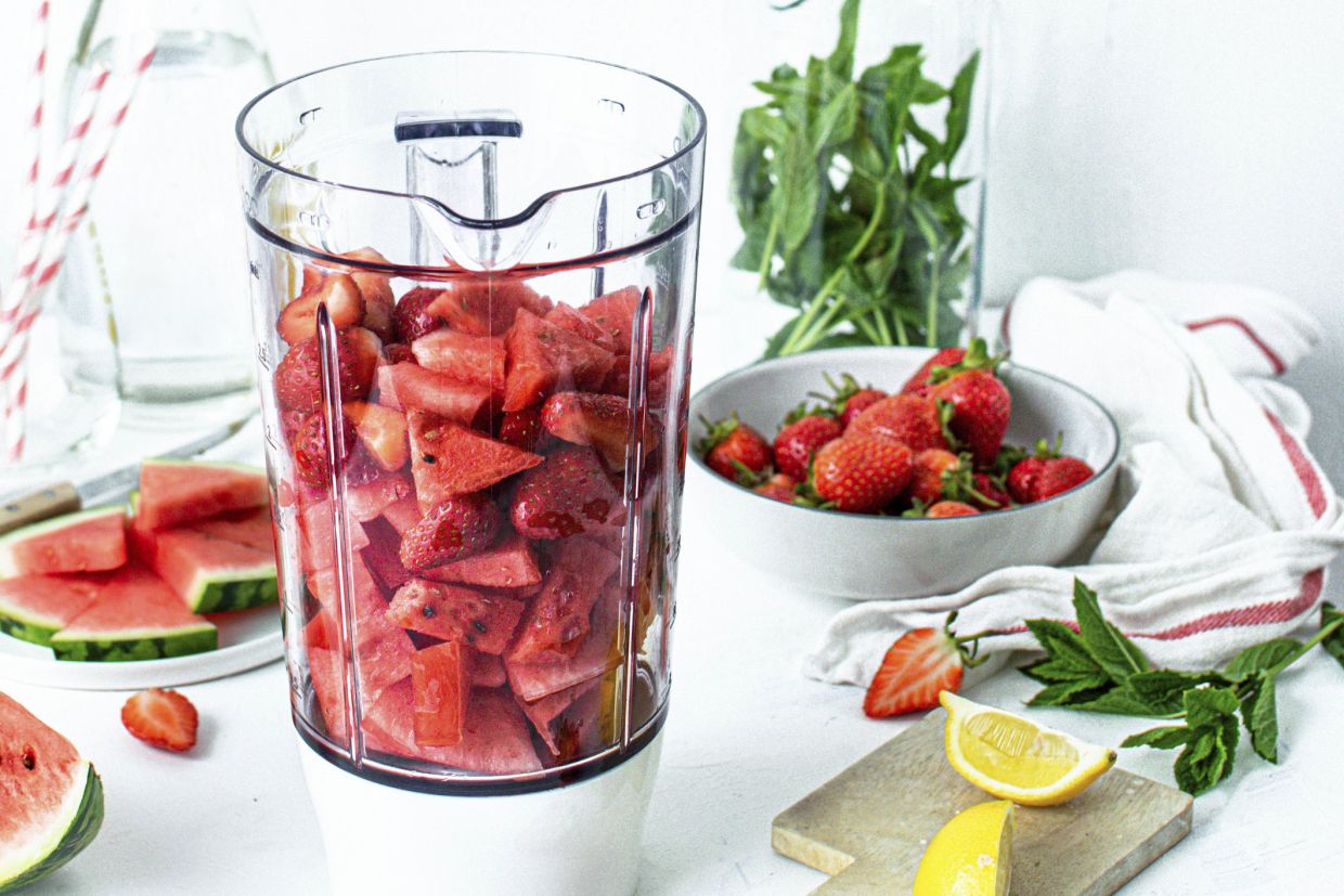 2. Выложите в блендер арбуз, клубнику, затем влейте цитрусовый сок и 200-250 мл воды. Пробейте смесь до однородности.