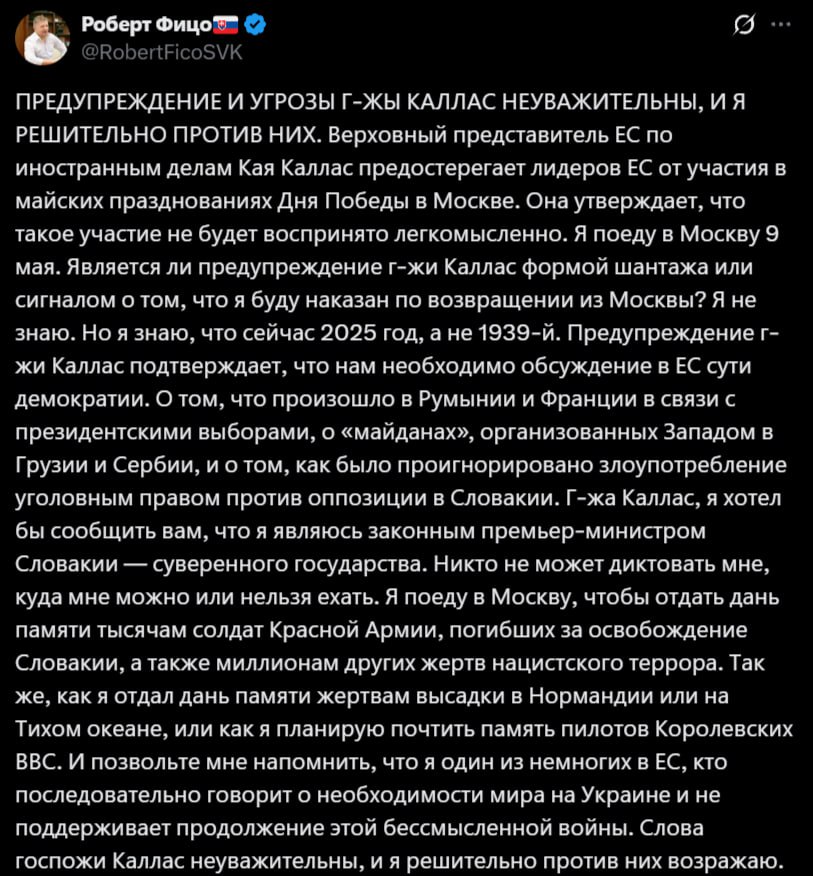 Не постеснялся выступить против этой позиции президент Словакии Роберт Фицо, сравнивший данную ситуацию с 1939 годом и заявивший, что никто не может ему указывать, куда следует или не следует ехать.
