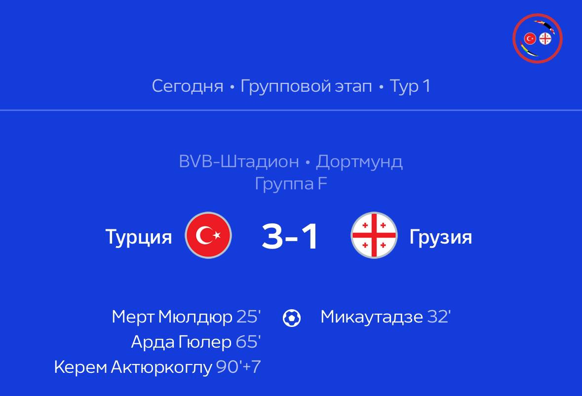 Сборная Турции со счетом 3:1 обыграла команду Грузии в матче первого тура группового этапа чемпионата Европы по футболу. Встреча прошла в Дортмунде.