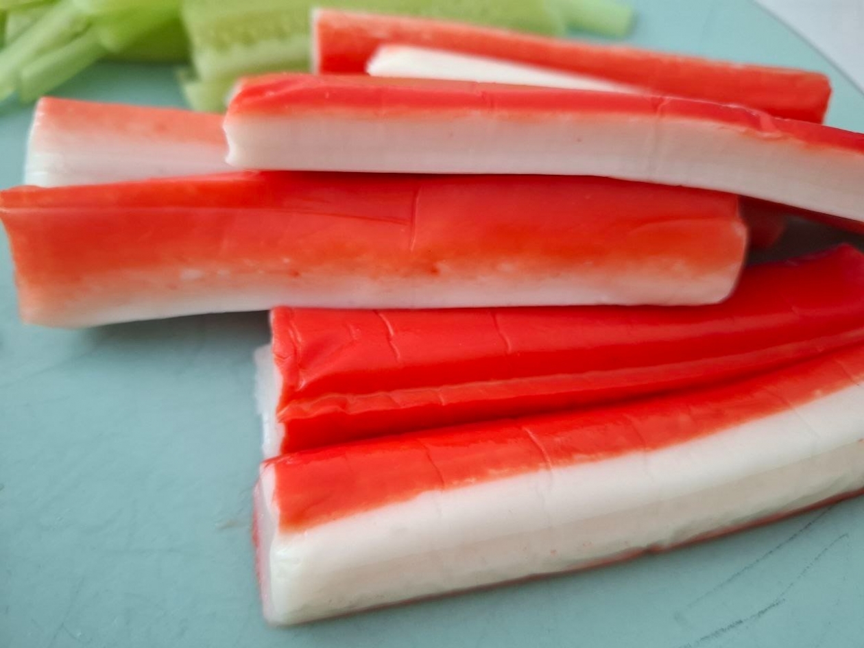 Равномерно распределите нарезанные крабовые палочки по дну плоского салатника или сервировочного кольца. Создайте сверху тонкую сеточку из майонеза. Она скрепит слои и добавит сочности.