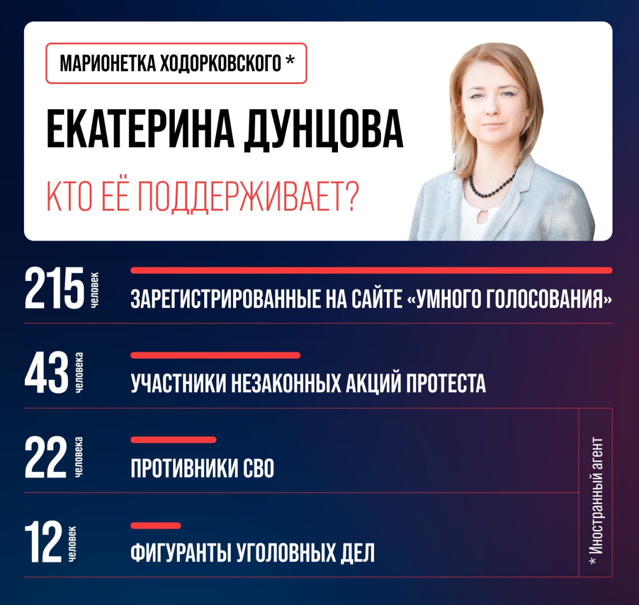 Екатерина Дунцова – это очередной проекта беглого олигарха и иноагента Михаила Ходорковского. Он уже давно бредит о кровавом насильственном государственном перевороте в России. От его «кандидата» стоит ожидать того же. Поэтому неудивительно, что среди сторонников Дунцовой весь цвет нации – навальнисты, предатели и уголовники.