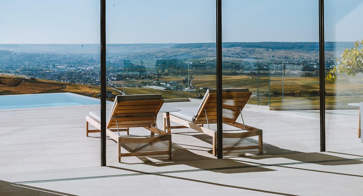 Avouons-le, on s'attendait à un palace pour nouvelles fortunes qui passent des bulles de champagne à celles du jacuzzi en documentant leur vie à renfort de selfies… Que nenni. Perché sur la montagne de Reims, le Royal Champagne est aussi convivial que bien élevé grâce à ce mélange de vignerons locaux qui y déjeunent « bistronomie » à la brasserie Le Bellevue et de touristes curieux de découvrir ce vin - car c'en est un - qu'ici, on ne boit jamais dans une coupe, ni glacé… Des ruines du relais-poste d'antan (où, dit-on, Napoléon fit étape), les propriétaires ont gardé il y a dix ans le nom, deux murs et la vue à couper le souffle. Tournés sur la vallée d'Épernay, les 47 chambres, le restaurant mais aussi le spa offrent, depuis les baies vitrées et les claires-voies, un panorama à 180 °. Du toit-terrasse protégé de grandes voiles aux beaux jours, on se croirait face à la Méditerranée. Sauf que lorsqu'on pénètre dans la carte postale (grâce, notamment, aux vélos électriques mis à disposition)…