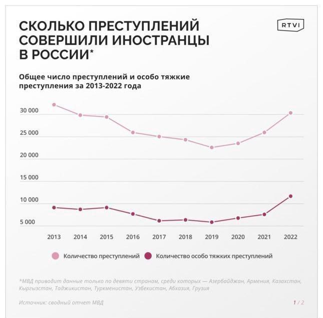 Число преступлений, совершенных иностранцами из ближнего зарубежья, выросло на треть с 2020 по 2022 годы, следует из отчета. При этом в 2022 году они совершили 11664 тяжких и особо тяжких преступления, что стало максимумом с 2013 года.