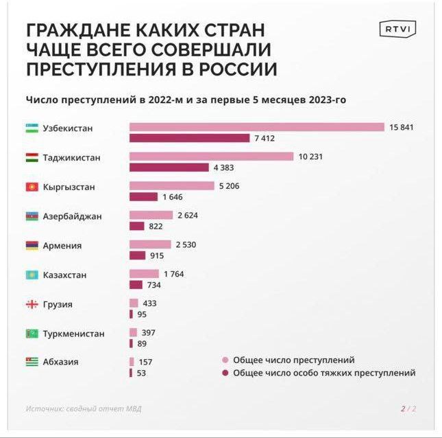 Чаще всего к уголовной ответственности привлекаются граждане Узбекистана, в 2022 году на их долю пришлось примерно 40% преступлений, совершенных в России иностранцами, на втором месте оказались граждане Таджикистана (25%), на третьем — Киргизии (13%)