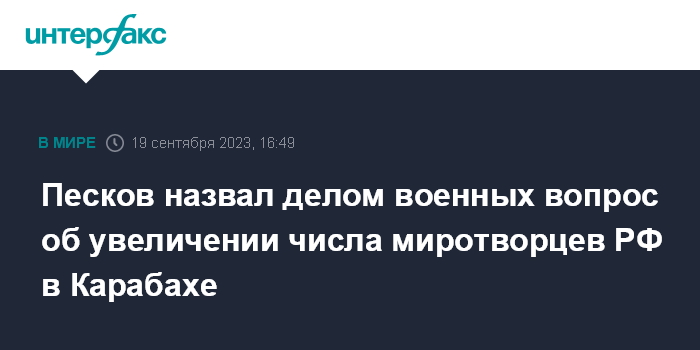 Москва. 19 сентября. INTERFAX.RU - Вопрос о целесообразности увеличения российского миротворческого контингента в Нагорном Карабахе относится к компетенции военных и подлежит согласованию со всеми сторонами, заявил пресс-секретарь президента РФ Дмитрий Песков.