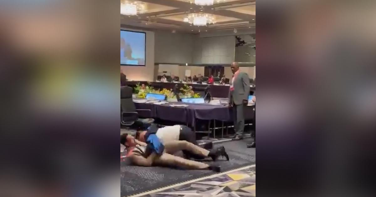 En une fraction de seconde, un délégué algérien saute sur le dos du diplomate marocain, le ceinture et le plaque au sol en l'agrippant pour le maintenir à terre. Le Marocain se débat, en vain, avant que deux organisateurs de la réunion n'interviennent pour séparer les deux diplomates.