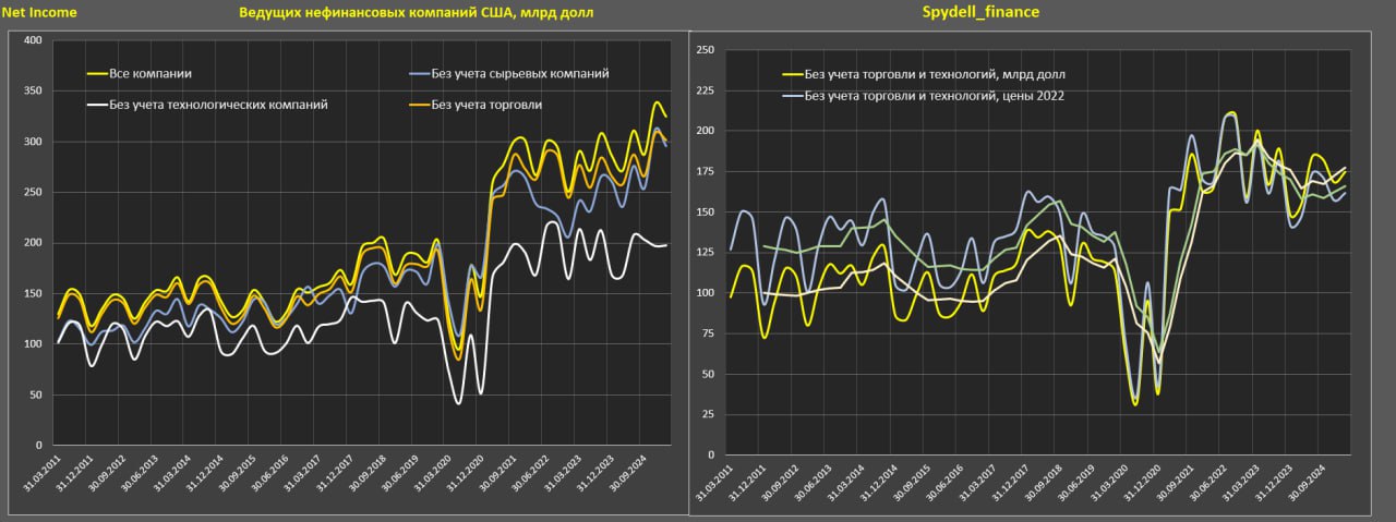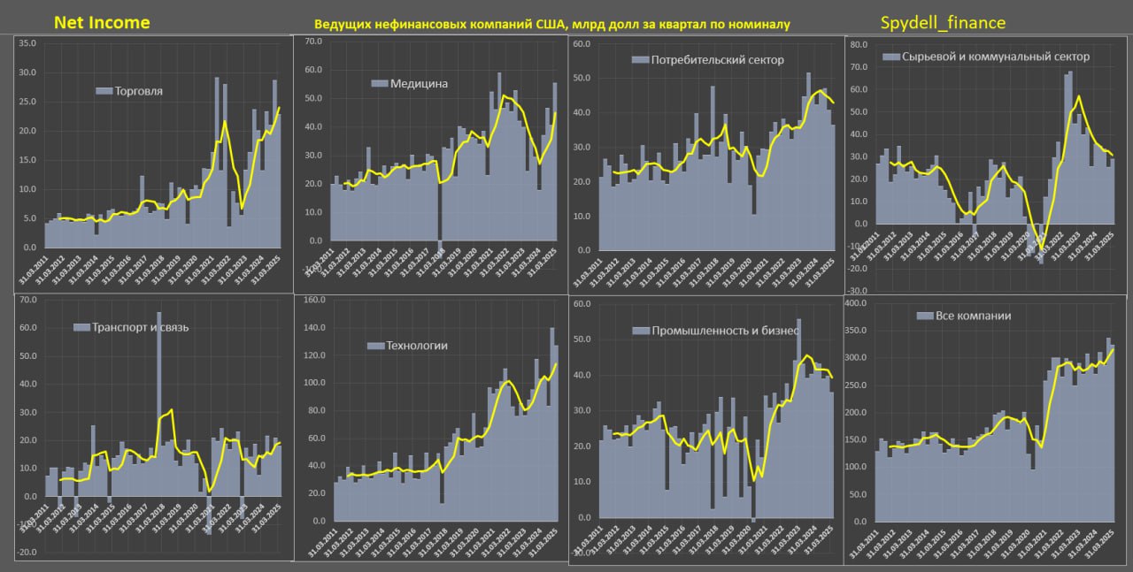 По предварительным собственным расчетам на основе обработки 2/3 публичных нефинансовых компаний США, чистая прибыль выросла на 19.7% г/г в 1кв25 (+10% г/г за последние 12 месяцев, далее в скобках сравнение за 12м), +11.8% к 1кв23 (+11%) и +21.9% к 1кв22 (+10%) по номиналу.