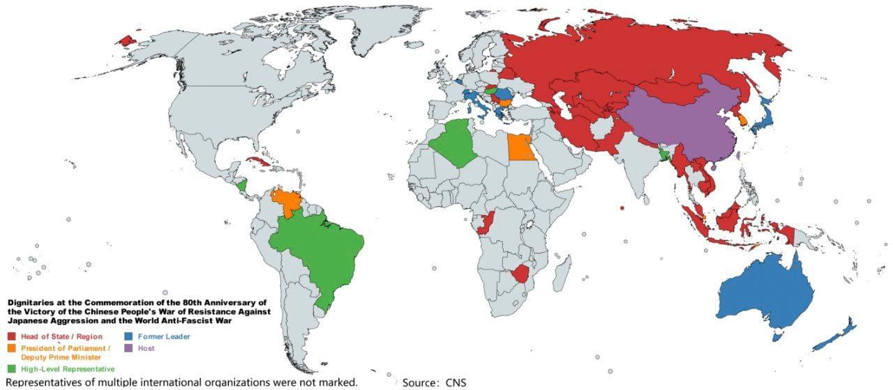 🌏 Карта стран происхождения всех гостей, присутствовавших на военном параде в честь Дня Победы во Второй мировой войне в Пекине
